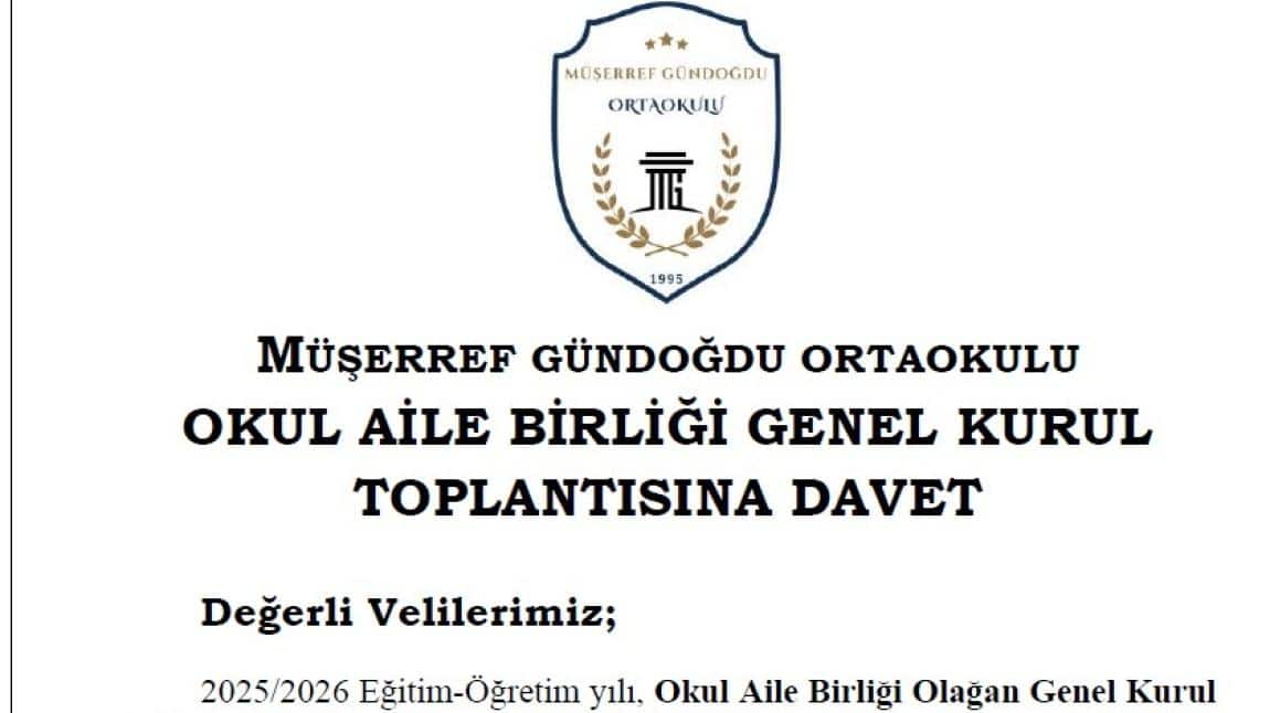 2025/2026 Eğitim-Öğretim yılı, Okul Aile Birliği Olağan Genel Kurul toplantısı, Okulumuz Salonunda, 02/10/2025 Perşembe Günü, saat 14.30’da, aşağıdaki gündem maddeleri doğrultusunda yapılacaktır.